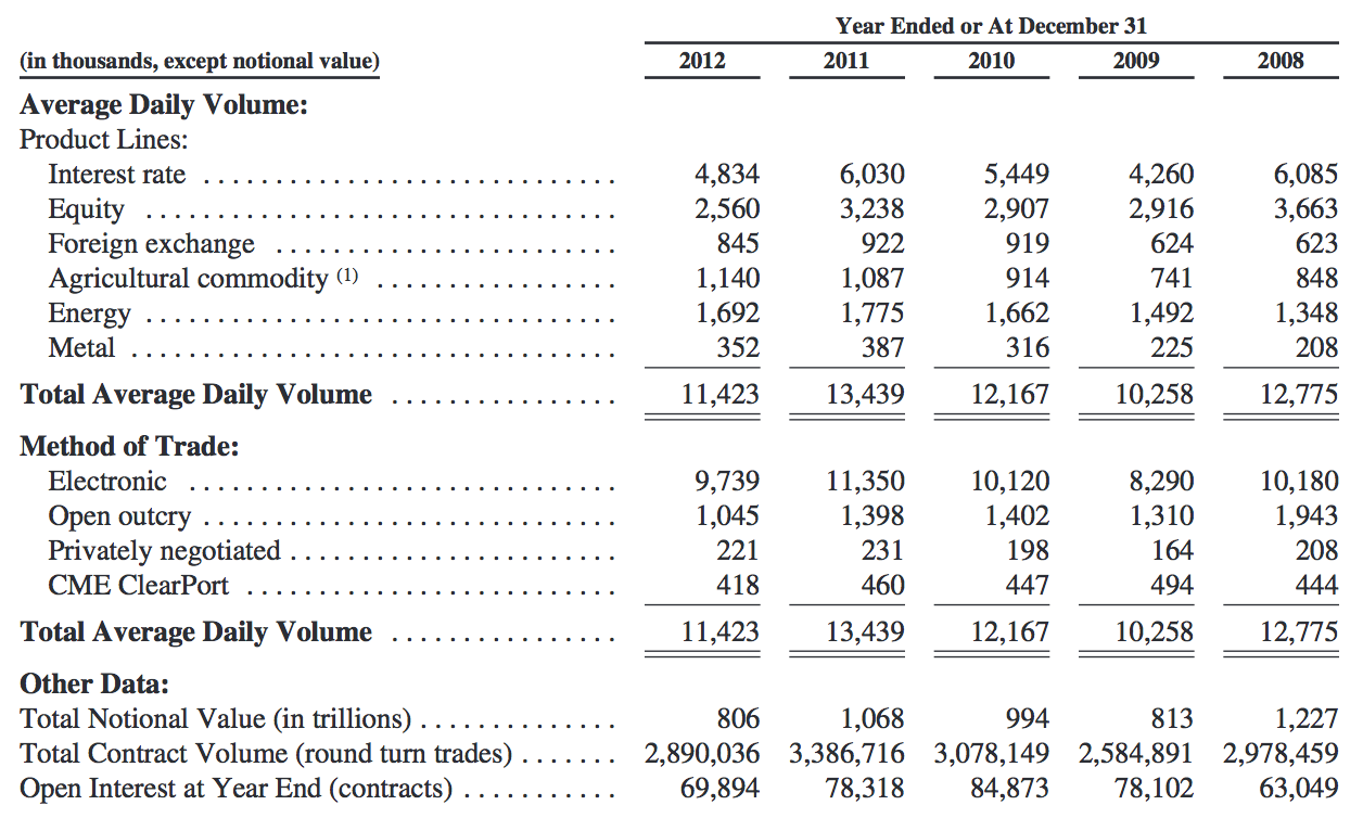 As you can see, the numbers are similar to those in 2011, with a slight 2.5% drop to reach $2,911 trillion. But I think that we can still call that a round €3 trillion, especially as I previously showed that there a number of major players that don't get reported. Specifically, we can certainly add a large number for CME (Chicago Mercantile Exchange). I downloaded their 2012 report here and found (on page 36) the following useful table showing that in 2012 they handled a notional value of $806 trillion - down quite a lot from the $1068 trillion in 2011, and way down on the $1227 trillion handled in those wonderful days back in 2008 (!)