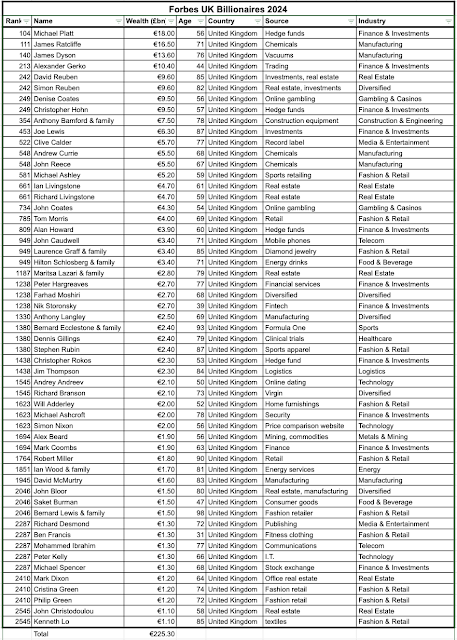 It's true that, according to the Forbes 2024 billionaires list, the UK can boast 55 billionaires. Here they are, and together they have $225.3 billion dollars in wealth. That might raise about £3.5 billion if you taxed at 2%.