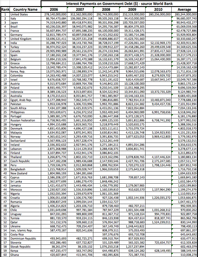 Again, it's the USA that wins the competition. They provided no less than $312.6 billion in interest payments in 2007. Don't forget that the US Treasury could perfectly well print money interest free, as Abraham Lincoln did when he printed $450 million in Greenbacks during the Civil War. In other words, the $312.6 billion can be thought of as a racket in which the banks extort money from US taxpayers.