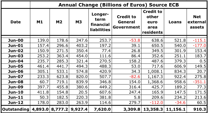 As you can see, the total M3 has gone up again - reaching €9.93 trillion at the end of june. Indeed, with a very few exceptions (shown in red), the figures are nearly always positive - i.e. the banks are continuously pumping new money (i.e. debt) into the system.