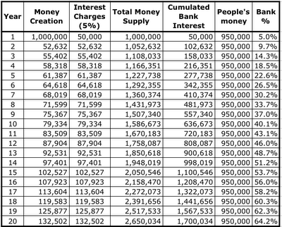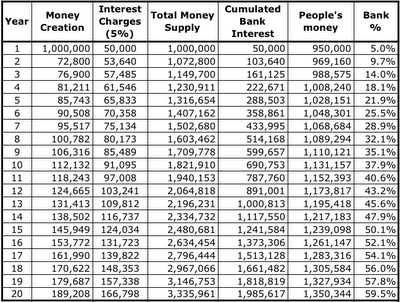 Imagine an island with a commercial bank that has been given the right to create the money supply and charge interest on the loans. At the beginning of year 1, it creates €1 million and loans it to the population who then use the money to go about their everyday business.  Suppose that the bank is  allowed to charge 5% interest. At the end of year one everyone has to cough up, and the bank gets €50,000 in interest charges. As you can see from the table below, a system designed like that would be a total disaster because, after 20 years, all the money has gone.