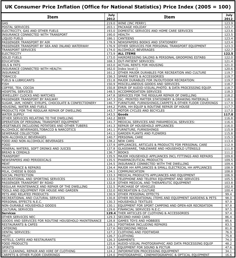Finally, there is the general question of inflation.  An editorial in Tuesday's Guardian discussed the latest figures from the Office for National Statistics. In the last five years, food prices in the UK have shot up 28.7%. Electicity, gas and other fuels have shot up 45.5%, and transport costs by nearly 25%. I had a look at the dataset from the ONS, and compiled the following table that shows the increases in price index for the 124 different items in their "shopping basket". The numbers give the increase in prices using 2005 as a baseline of 100.