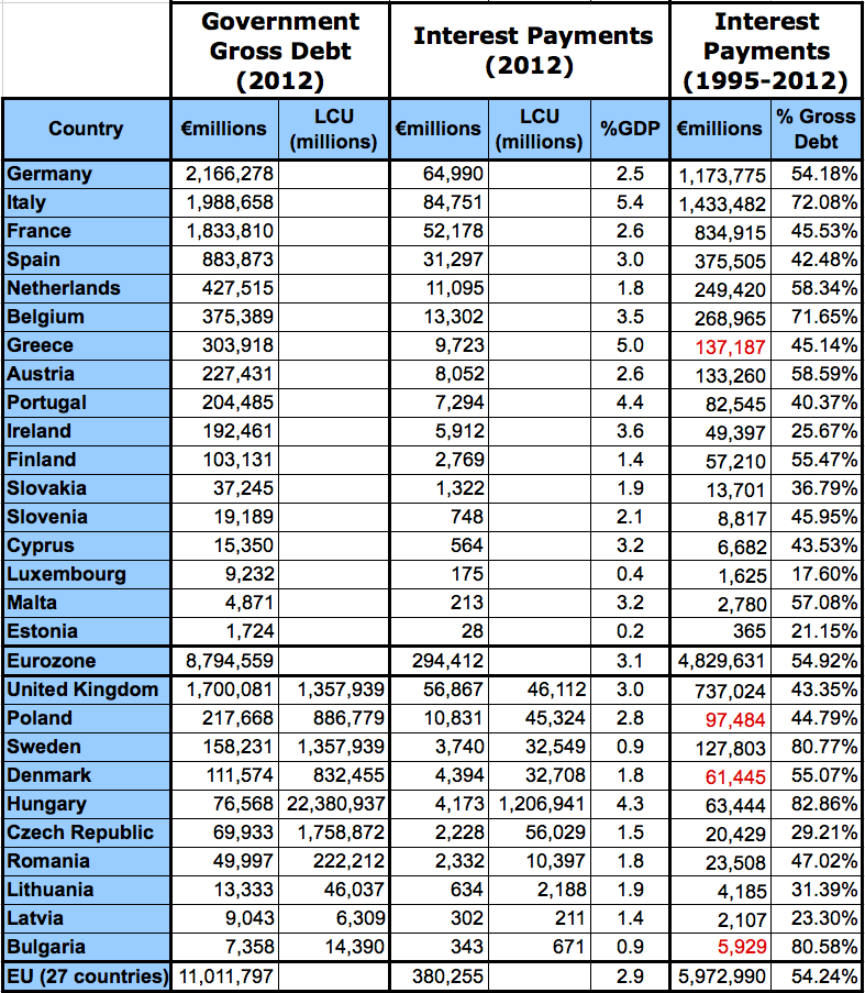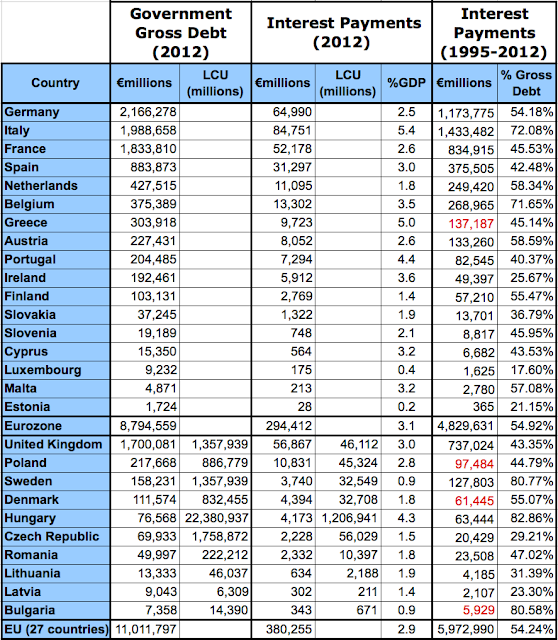 European Public Sector Debt and Interest Payments for 2012 - €11 trillion debt, €380 billion in interest