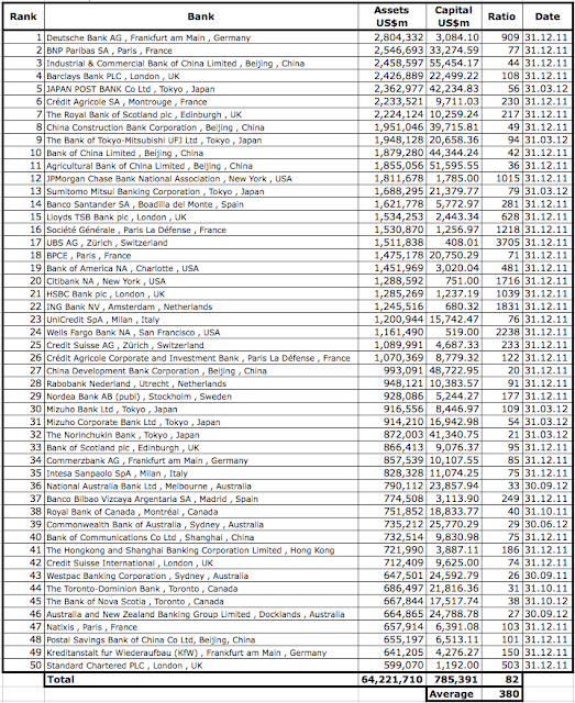 I thought I would try another tack. Using information from an interesting site called BankersAccuity, I downloaded information about the world's 50 biggest banks. I've compiled the numbers into the following table which gives numbers for the total assets of each bank, together with the amount of capital that each one has. It makes for interesting reading.