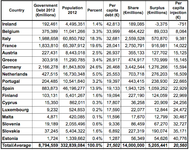 Finally, in the Eurozone, the European Central Bank should create €44,258 for every Eurozone citizen. I've already argued the the simplest and fairest way to do this would be to provide each Eurozone government with an amount that directly depends on the population size.