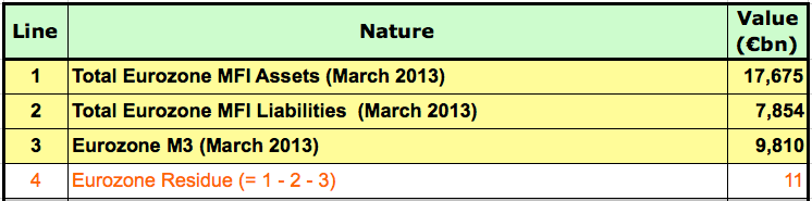 The numbers in lines 1 to 3 are directly from the ECB document. Line number 4 shows that if you take total MFI assets, and subtract MFI Liabilities and M3, you get a final number of €11 billion, almost nothing when we are talking about totals of €17.7 trillion. It could almost be a rounding error!