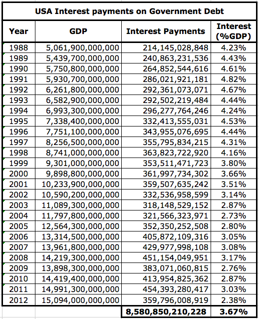 As you can see, the average value is 3.67% over the period. There are actually signs that the greed of the markets has dropped a bit recently because it has indeed dropped from a peak of 4.82% in 1991 to only 2.38% last year. But the $360 billion of taxpayers money handed over in 2012 is still one hell of a lot to pay. Especially when you realize that (a) the US Treasury could have generated the money free of charge, and that (b) the Banks who have been lending "money" to the Government can create the money they lend out of thin air.