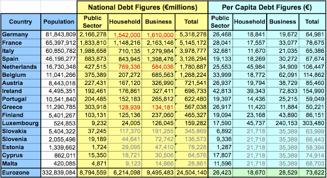 I find it very intersting that Germany, which likes to lecture everyone in the eurozone about how only they know how to behave in a responsible way, is almost exactly at the average for per capita public sector debt (€26,400) and household debt (€18,700). OK, their business debts levels are a bit lower that the Eurozone average (€19,700 instead of €28,500), and so overall per capita debt is a bit less than the average.  Big deal, given how fantastic German industry is. If they are so wonderful, why is the German business community in debt to the tune of over €1.6 trillion?