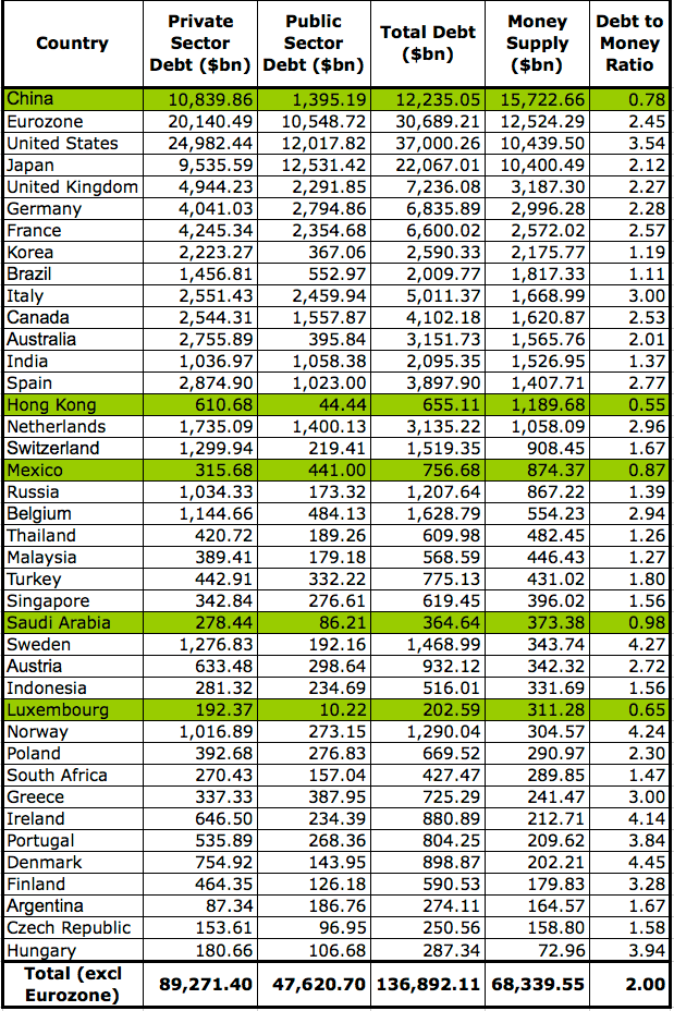 There are only five countries that actually have a money supply large enough to cover their debt (coloured in green in the table). Apparently Mexico is one of them, but this seems extremely odd - maybe an error in there somewhere.
