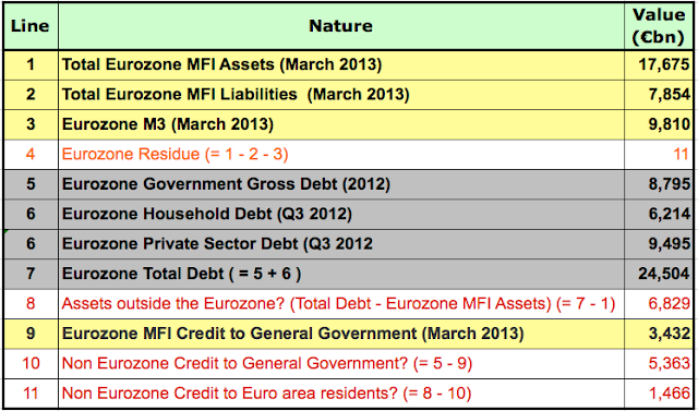 If you've been following my recent blogs, you will know that I am trying to understand how it is possible that Eurozone Debt is 2.5 times larger than the Money supply. Specifically, if you take the BIS figures for the 3rd Quarter 2012 for Household debt (€6,214 billion)  together with Nonfinancial (business) sector debt (€9,435 billion) and add in the ECB figures for public sector debt at the end of 2012 (€8,795 billion), you reach the eye watering total of €24.5 trillion of debt. That number is roughly 2.5 times bigger that the latest figure for M3 (€9,810 billion).